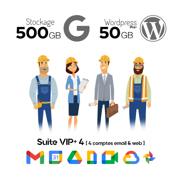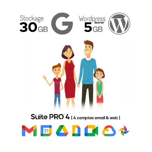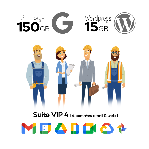 - Quatre comptes Google Workspace incluant quatre emails personalisés @filippi.fr sur la plateforme Gmail. Stockages (15Gb, 30Gb, 150Gb ou 500Gb)
